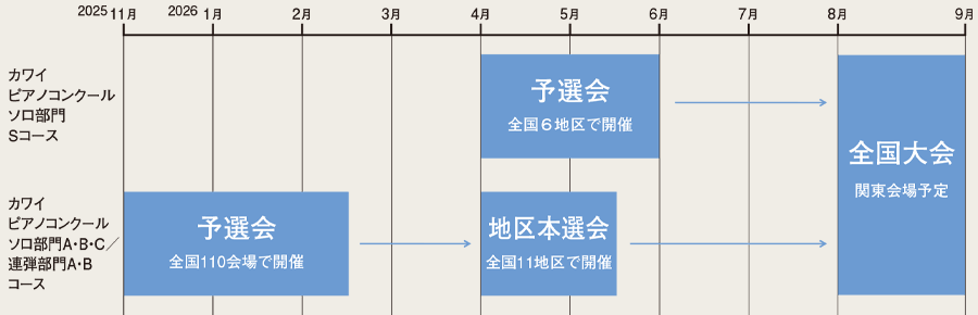 ・「ピアノコンクールソロ部門Sコース」は、予選会→全国大会の2段階で実施。