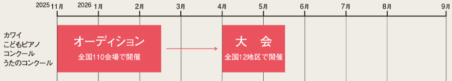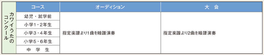 ・「こどもピアノコンクール」と「うたのコンクール」は、オーディション→大会の2段階で実施。全国大会は行いません。